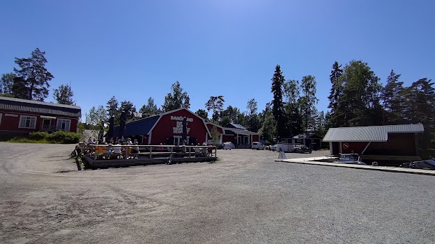 Saarelle päästäseen pitää matkustaa meriteitse. Ja kun nyt sanotaan meriteitse, tarjoitetaan alle 200m lossimatkaa saarelle. Mutta lossimatkahan sekin on, vaikkakin varsin lyhyt. Lossin jälkeen vastassa on pieni Barösundin kylä, josta löytyy niin venesatama, kauppa kuin baarikin. Iloisia vesillä liikkujia olikin koko baarin täydeltä jo aamupäivästä. Edellisenä iltana oli kuulemma pyssyt heiluneet ja poliisit olivat selvitelleet jotain motoristien välisiä riitoja.